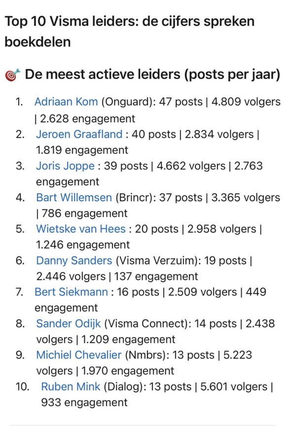 Iets anders wat opviel? Onze klanten Jeroen Graafland en Adriaan Kom pronken bovenaan de lijst van Visma-leiders op #1 en #2. En ja, dan voelen wij ons uiteraard vereerd.