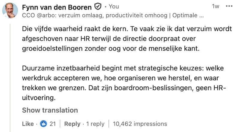 @Arbo bevond zich in een cruciale groeifase. Na snelle schaalvergroting van 11 naar 53 medewerkers wilde commercieel directeur Fynn van den Booren de volgende stap zetten: autoriteit opbouwen in de markt en een sterke persoonlijke merkidentiteit neerzetten die @Arbo onderscheidt van traditionele arbodiensten.