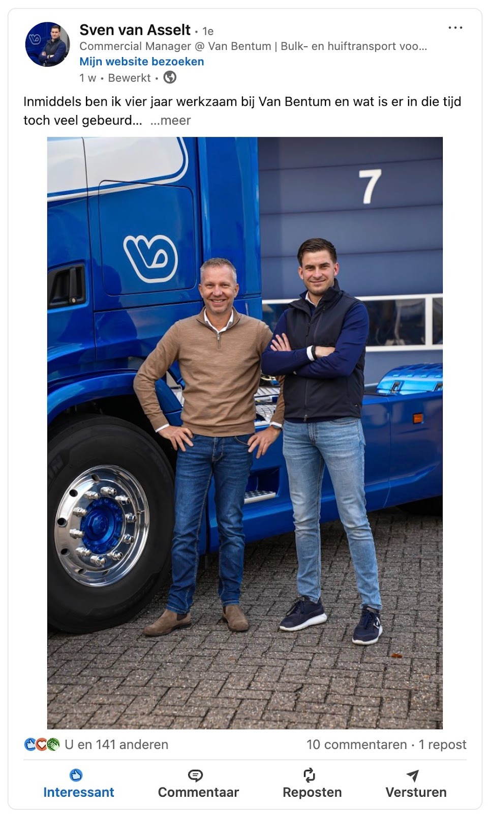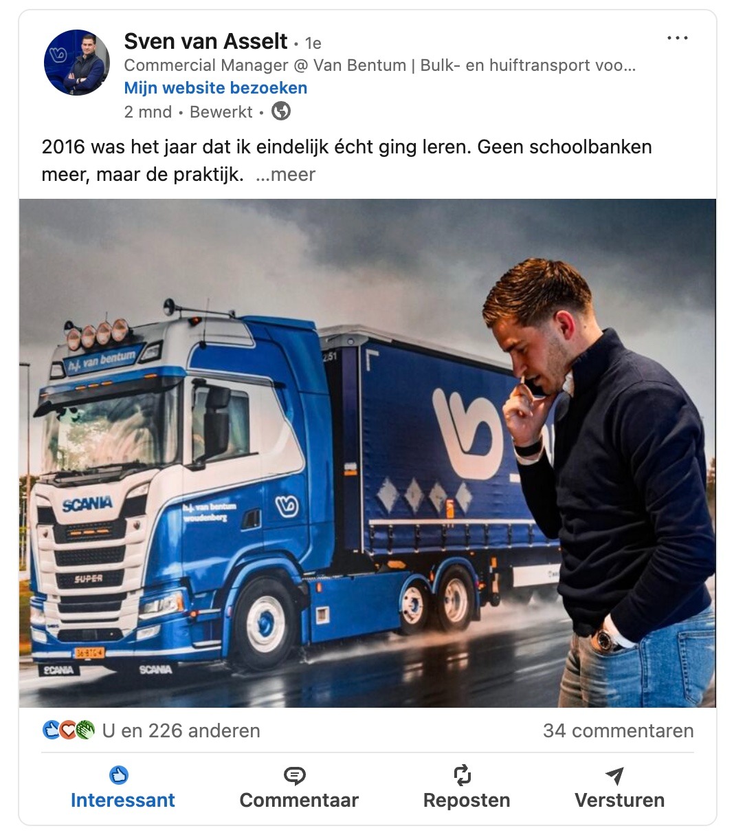 We profileren Commercial Manager Sven van Asselt als het gezicht van Van Bentum. Strategisch gezien zetten we in op een combinatie van persoonlijke en zakelijke verhalen om zo authenticiteit te tonen zonder zijn professionaliteit te verliezen. De content straalt daarbij betrouwbaarheid en geloofwaardigheid uit.